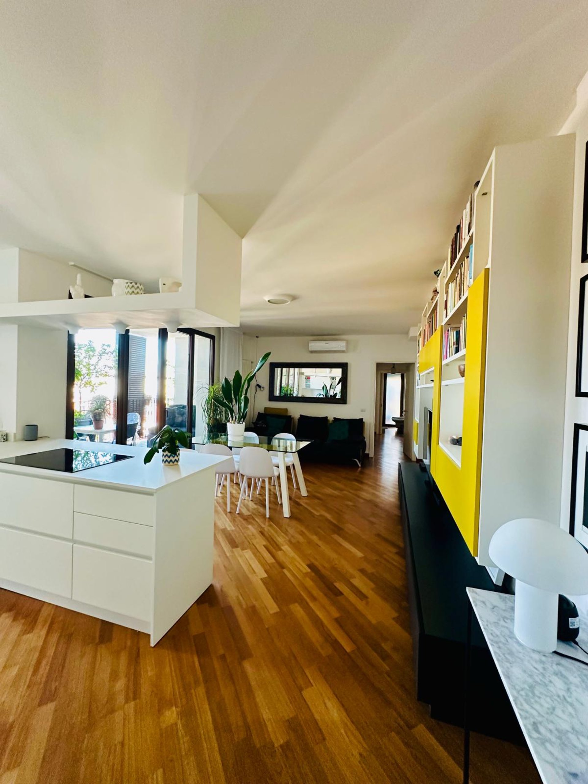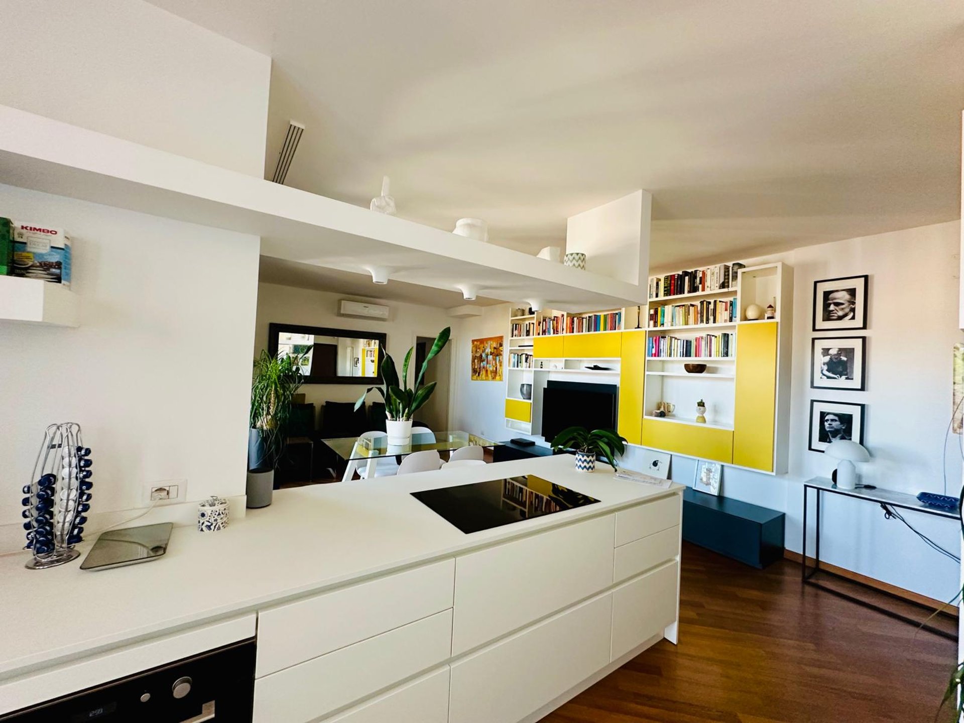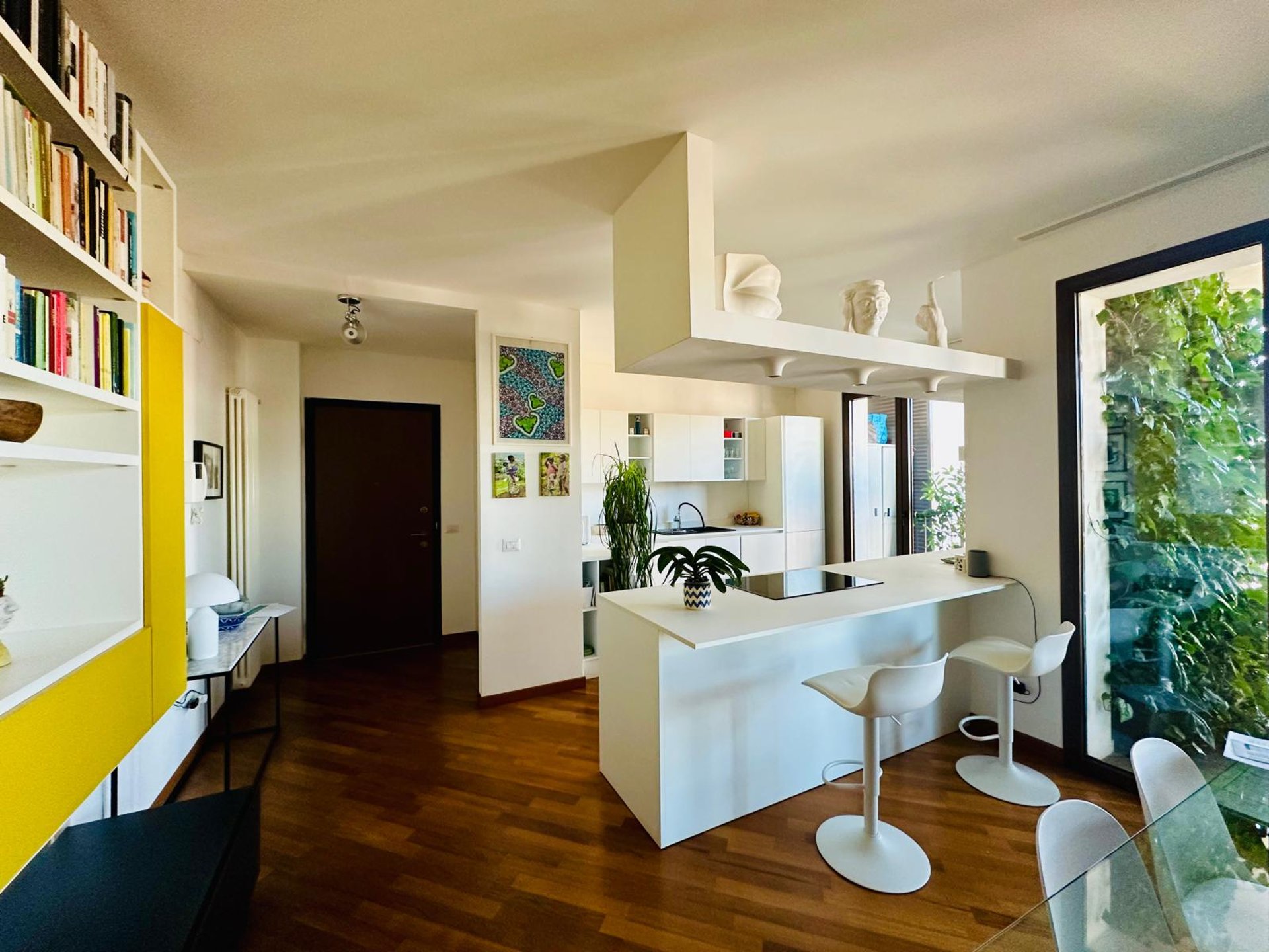 L’INGRESSO SI APRE SU UNA ZONA GIORNO AMPIA E ACCOGLIENTE, DOVE IL SOGGIORNO DIALOGA ARMONIOSAMENTE CON LA CUCINA A VISTA DAL DESIGN CONTEMPORANEO. LA PENISOLA ATTREZZATA DIVENTA IL CUORE DELLA CASA: PERFETTA PER COLAZIONI LENTE AL MATTINO, APERITIVI CON AMICI O CENE INFORMALI. LO SPAZIO È PENSATO PER ESSERE VISSUTO DAVVERO, CON UN’AREA PRANZO CONVIVIALE E UNA CONFORTEVOLE ZONA RELAX CON GRANDE DIVANO, LIBRERIA E TV CHE CREANO L’AMBIENTE IDEALE PER MOMENTI DI QUIETE O PIACEVOLI SERATE IN COMPAGNIA.